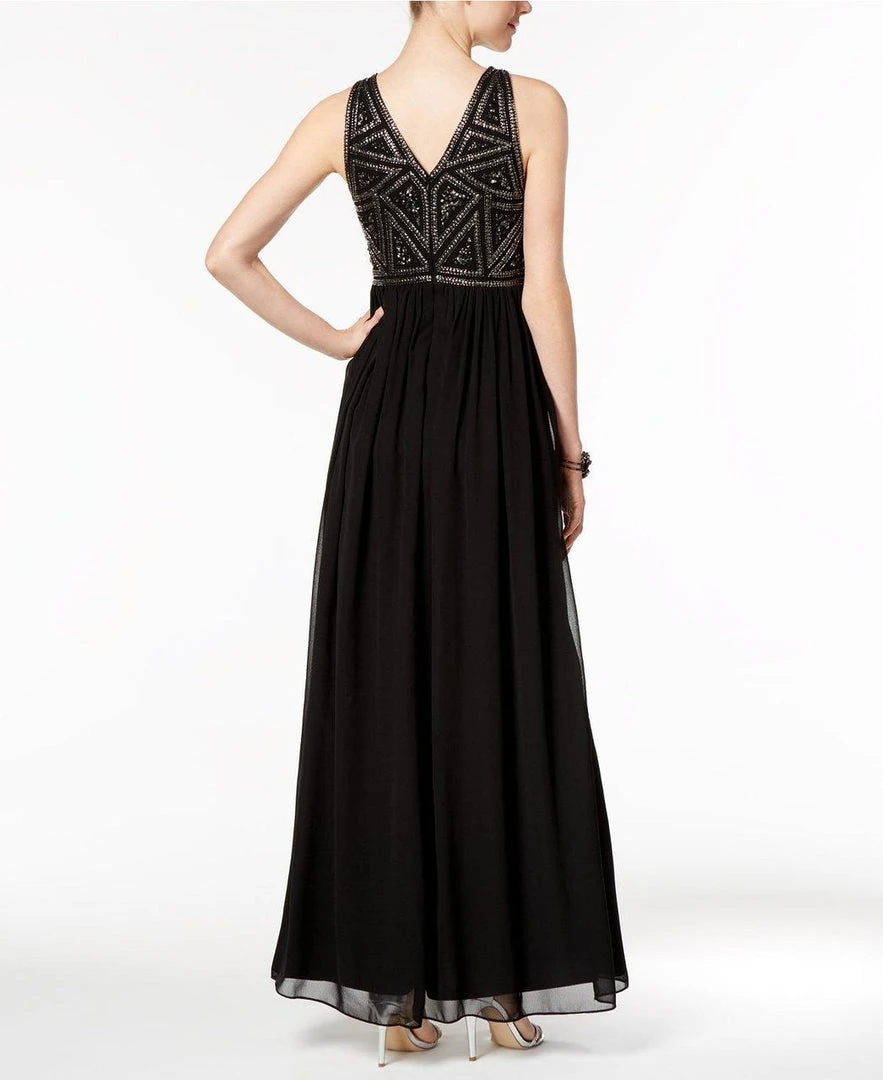 | Details: | Embellished Bodice, Sleeveless, Pleated Skirt, Full Length, V Back, Back Zipper Closure, Chiffon, 100% Polyester |