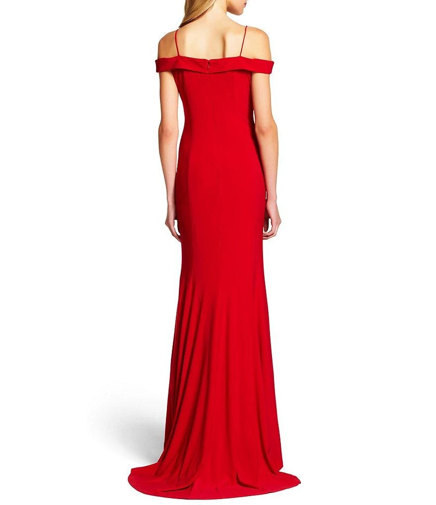 Be a woman of style and beauty in this classy Adrianna Papell 191916940 evening dress. This lovely ensemble features a fitted bodice topped with an off-shoulder neckline supported by spaghetti straps that leads to the mid-open straight back. The curve hugging silhouette cascades to the floor and finishes to a beautiful mini train. A back center zipper closure secures this style. This Adrianna Papell design is a sure winner creation!