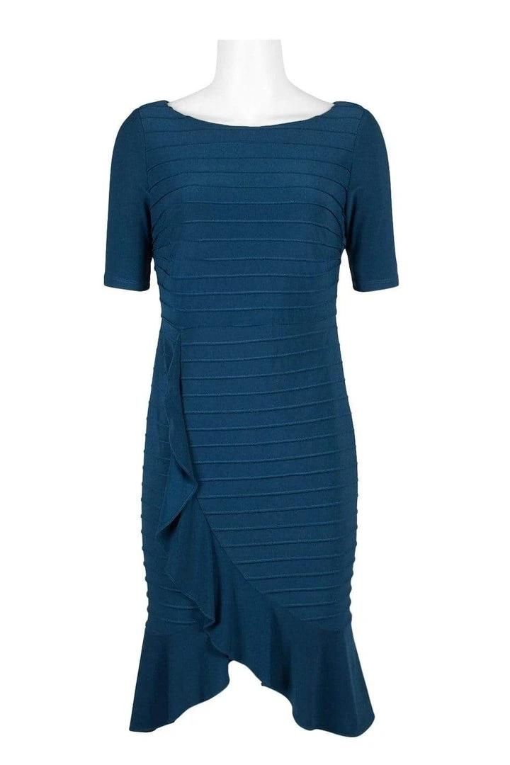 Show your sophisticated sense of style in this dress by Adrianna Papell AP1D103506. This ribbed jersey dress shows off in a bateau neckline with short sleeves. The dress has a fitted bodice and a back zipper closure. The dress is styled with flutter details that continue to the mid-thigh sheath skirt. Look sassy in this cocktail dress by Adrianna Papell. Model is wearing Dark Scarlet color.