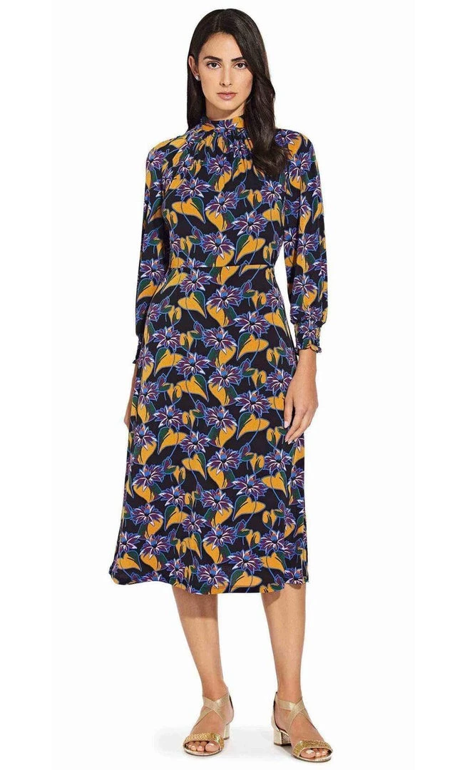 Look vibrant and pretty in this Adrianna Papell Day AP1D103553 day dress. Fashions in high neck, this dress features long sleeves and a flowy skirt in tea length hem. The colorful print on this dress will give you a relaxed look. This Adrianna Papell Day creation creates a fun and exciting look.