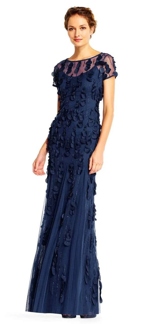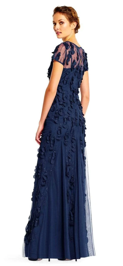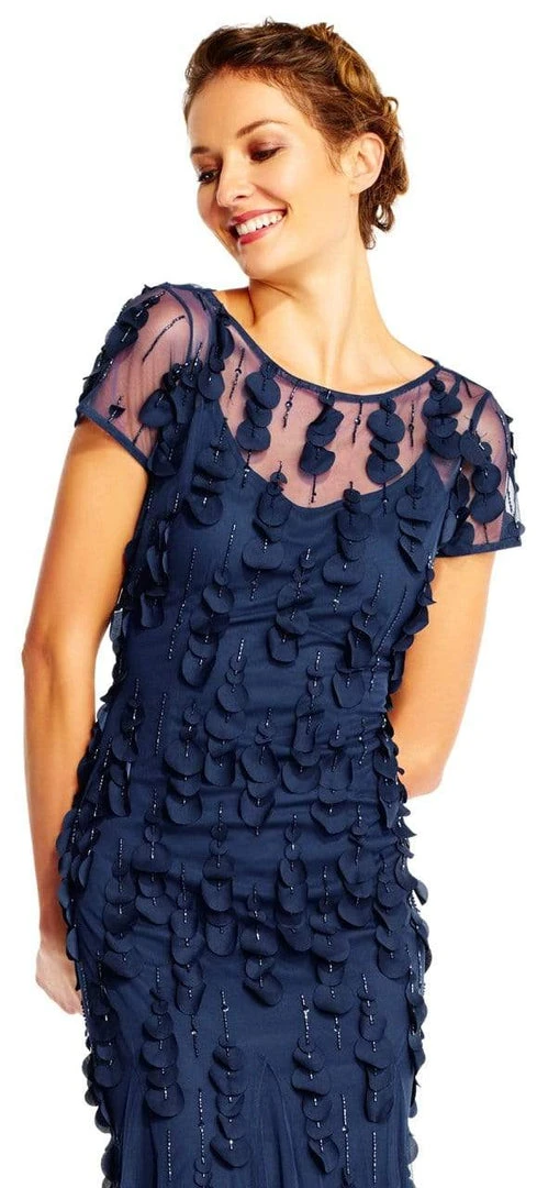 | Details: | Beaded Mesh (100% Polyester) Lining (100% Polyester), Sheer short sleeves, Back keyhole, Godets, Petal appliques, Sheath skirt |