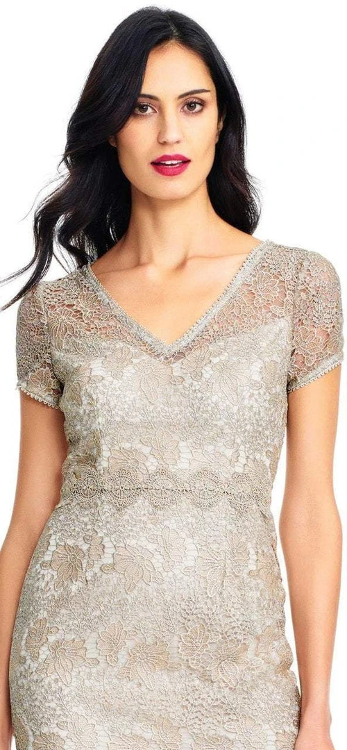 Display your natural beauty in this elegant evening dress by Adrianna Papell AP1E202688. Tailored in lace, this gorgeous evening gown offers a fitted bodice framed with a V-neckline and short sleeves. This gown tapers to a full length hemline with a sheer full back. A center zipper closure secures the back as it flaunts a slit that enables an ease of movement. This Adrianna Papell ensemble is perfect on your next formal event.