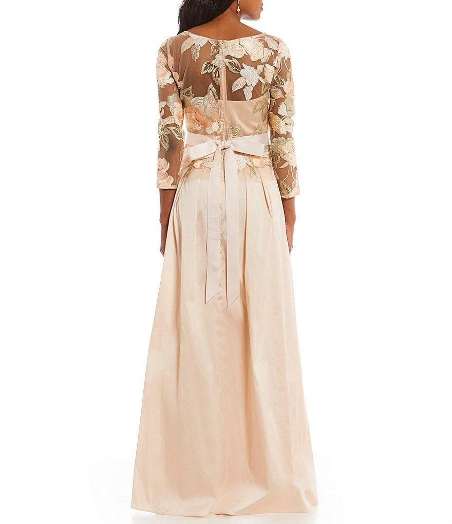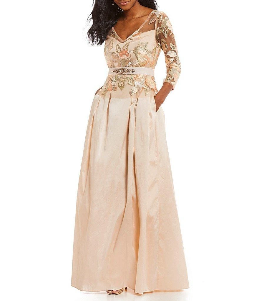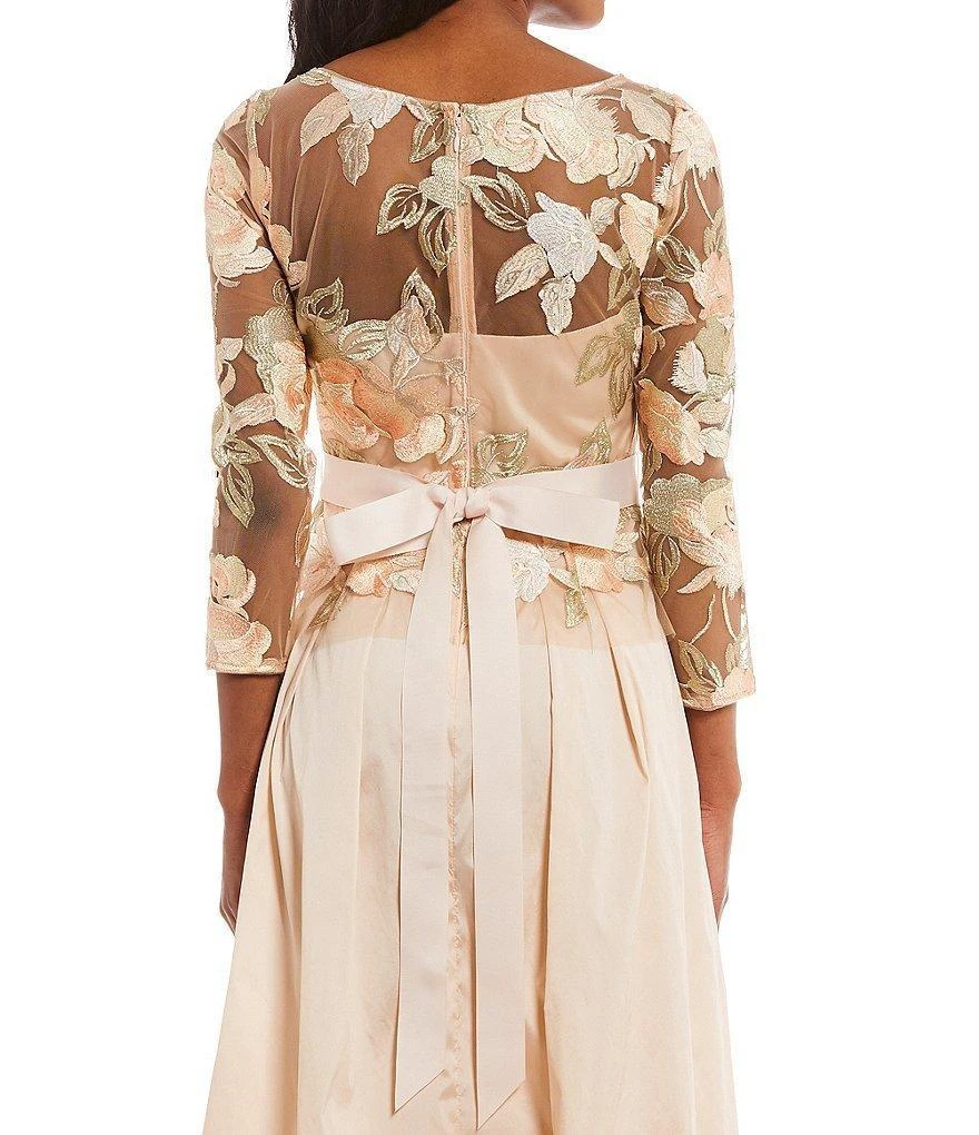 Portray the rich variety in design of this dress from Adrianna Papell AP1E203037. Brandishes in an illusion V-neckline with sheer long sleeves. The fitted bodice is styled with beautiful floral embroidery and cinched at the waist with a bow belt with bead embellishments. The back has a zipper closure and from the empire waist flourishes a full-length taffeta A-line skirt. This Adrianna Papell dress is sure to make a daring statement in that special affair!