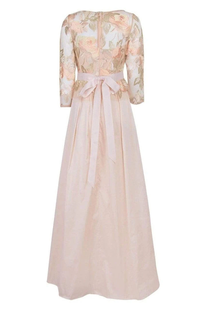 | Details: | Quarter length sleeves, Floral embroidery, Beaded belt, A-line skirt, Pockets, Taffeta, Back zipper, Bow belt, Sheer fabric |