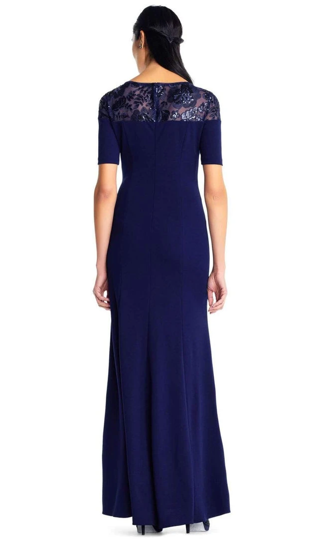 Bring on the drama in this Adrianna Papell AP1E203244. This floor length dress features an illusion bateau neckline adorned with floral embroidery. Framed with short sleeves, this stretch crepe dress reveals a straight silhouette complemented with a front side slit. Capture the glamour as you walk on this stunning gorgeous Adrianna Papell creation.
