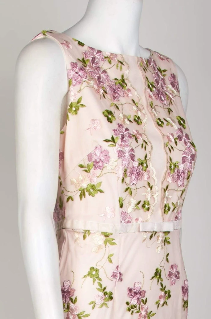 | Details: | Sleeveless, Back zipper, Floral embroidery, Bow belt, Fitted bodice, Sheath skirt, Back zipper, Scalloped hemline |
