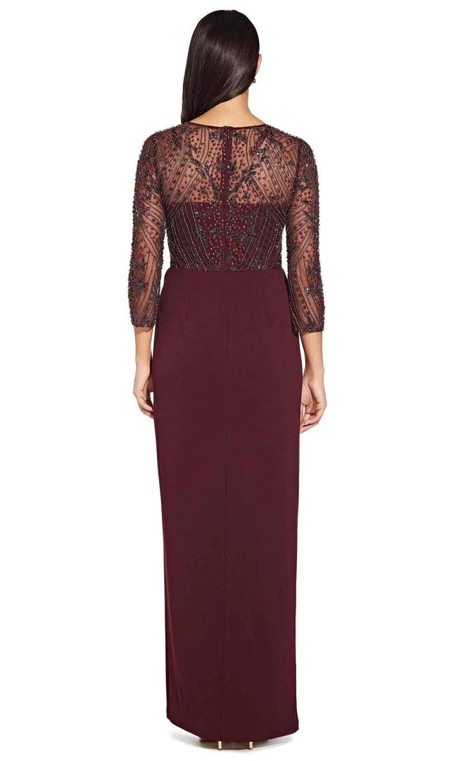 Look fantastic for your next formal event in this dress by Adrianna Papell AP1E205600. Fashions in jewel neckline with quarter sleeves, this gorgeous dress is adorned with beads. This floor length dress is accented with a ruffle detail and complemented with a side slit. Experience the outstanding effect in this creation by Adrianna Papell.