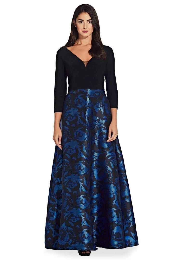 Be the spectacular belle on your next formal event in Adrianna Papell AP1E206803. This long dress has a jersey fitted bodice with a plunging V-neckline and a quarter length sleeves. The back has a zipper closure. The A-line skirt is made of floral print jacquard fabric and styled with pockets. This Adrianna Papell dress is sure to make you the darling of the party!