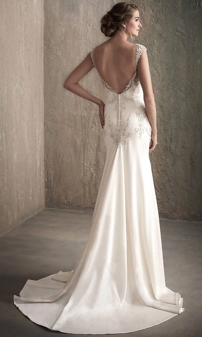 | Details: | Beaded and Embroidered Bodice, Cap Sleeves, Silky Satin, Open Back |