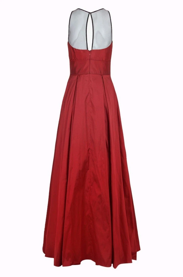 Get that royal look with this vibrant evening formal ensemble by Aidan Mattox 54467610. This taffeta gown features a scoop neckline, sleeveless front bodice with sheer mesh inset at the center, while the back reveals a cut out detail with illusion mesh frames. Self-fabric wide band encircles the waist. The box pleated A-line skirt appeals perfectly with floor length hem. This elegant Aidan Mattox dress would make a luxurious prom dress or as black tie evening gown.