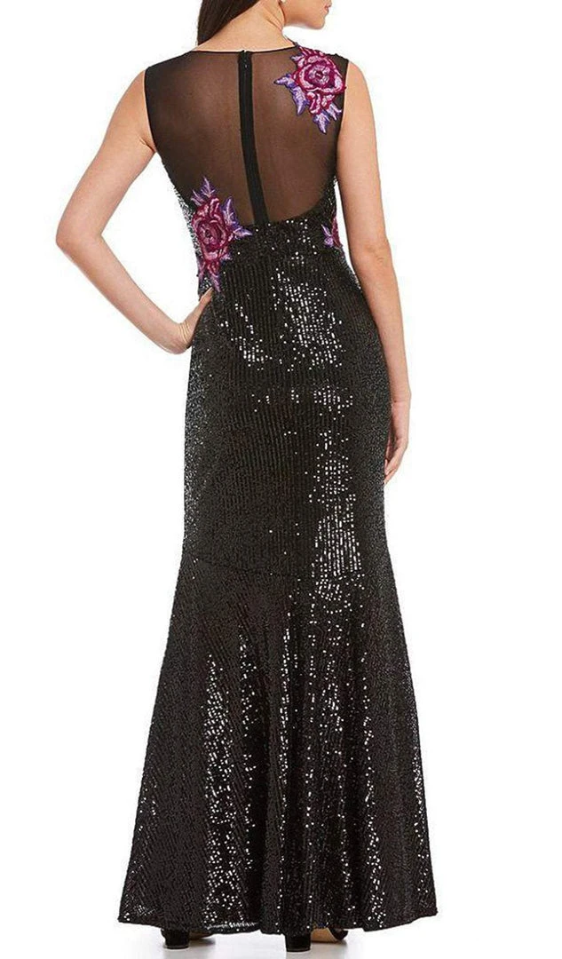 Fall in love when you slip on this attractive evening dress by Aidan Mattox MD1E201740. The fitted bodice offers a V neckline with cowl detail complemented with a sheer full back secured with a center zipper closure detail. This dress is fully sequined adorned with beautiful floral embellishments. The skirt reveals a sheath silhouette which tapers to full length hem. Look classy in an attractive Aidan Mattox creation.