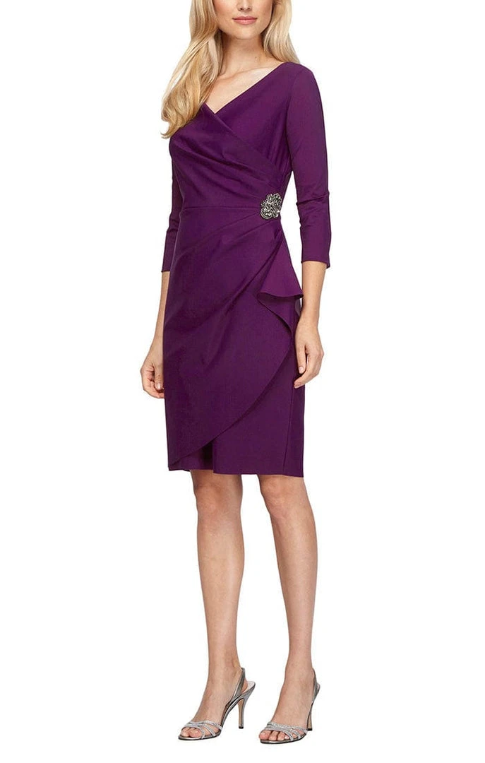 Be ready to fascinate everyone in this creation by Alex Evenings 134134. This short dress flaunts a V-neckline with quarter length sleeves. The surplice fitted bodice is accented with beading and ruffled detail. The skirt reveals a mid-thigh hem in a sheath silhouette while the back shows a V-open cut with zipper closure. You’ll be envied in an unbeatable design from Alex Evenings.