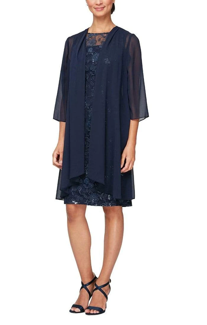 Look fresh and pretty in this creation by Alex Evenings 81171013. Show off your sophisticated sense of style as this dress is made with embroidered floral lace and sequin throughout. The sleeveless and illusion jewel neckline is top with elongated cascade ruffled chiffon jacket that adds a full drama to this magnificent creation. The sheath skirt flows down to knee length hem while the full back has a center zipper closure to complete the look. This Alex Evenings design is truly a definition of glamour. Dress is pictured in Navy and Light Blue colors.