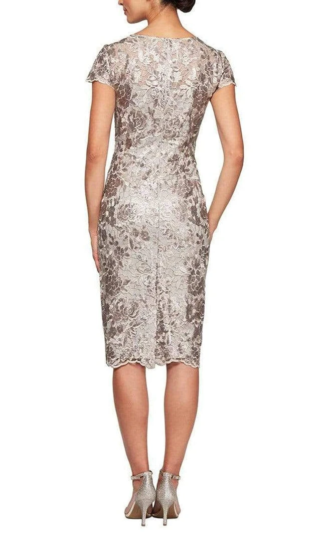 Look stunning in this vogue dress by Alex Evenings 8117884. This dress is made with embroidered textures fabric and graces in jewel neckline and short sleeves. It is styled with scallop detailing of the hem and then proceeds with a knee length sheath silhouette. This Alex Evenings is sure to make you the darling of the party!