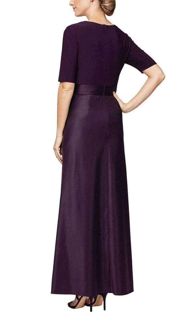 Unveil that inner sophistication in you when you flourish in this exceptional Alex Evenings 81351533 creation. Brandishes in a pleated bodice that creates a surplice style and a bow accent that adds glamour to the whole ensemble. Features a modest style with its elbow length sleeves, V-neckline, and full back. The skirt slims slightly through the hips and flares softly creating an A-line silhouette with a side pocket to keep your phone in as you enjoy the party. Perfect for a mother of the bride, the military, or church special gatherings, this Alex Evenings creation is a must-have! Model is wearing eggplant, and Navy colors.