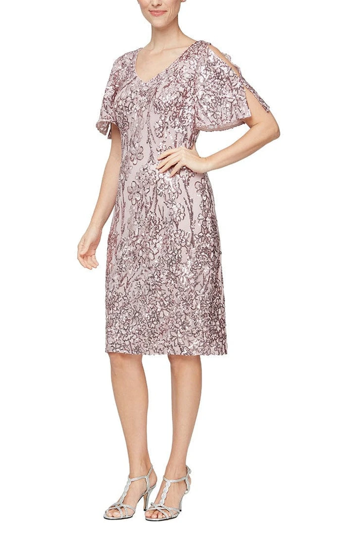 Glamour gets gorgeous with this Alex Evenings 8196728 dress. This all-over floral sequin dress showcases a V-neckline and short flutter sleeve with a cold shoulder. This knee-length dress also highlights a V-shaped cut and center zipper closure. This Alex Evenings style is sure to create a striking look that is sure to make anyone remember your grand entrance.