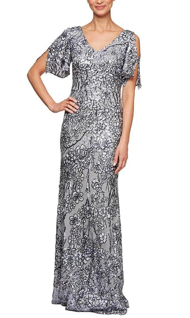 Dressed in a dazzling gown from Alex Evenings 8296611 collection, you will be surrounded by decadence. Featuring a floral pattern that cascades down the length of the dress, this elegant gown is embellished with beads and sequins that add shine and shimmer. It has a full length column silhouette and a V-modified neckline, which is paired with cold shoulders and fluttered short sleeves for a fashionable look. Feel dainty and feminine in this enchantingly designed Alex Evenings dress. Model is wearing Silver color.