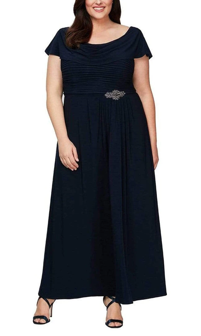 Get glamorous look with this dress by Alex Evenings 84351491. This matte jersey dress features a scoop neckline with sleeves. It has a pleated bodice coupled with a cowl back and is detailed with embellishment. From the waist flourishes a full length, flowy, A-line skirt. This Alex Evenings dress is perfect for any formal evening.