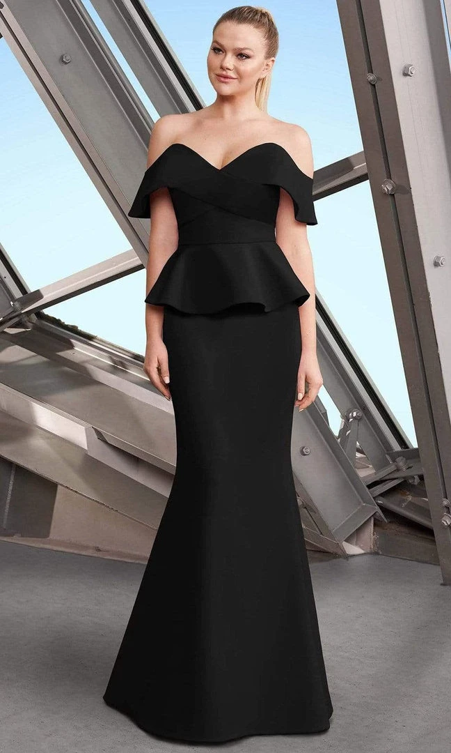 Appear in elegance in Daymor Couture 1151. This charming dress fashions an off the shoulder neckline with fitted bodice styled with a peplum detail. The back is styled with a trail of buttons. The skirt forms a trumpet silhouette and runs at full length hem. This Daymor Couture dress is sure to make you the darling of the party!