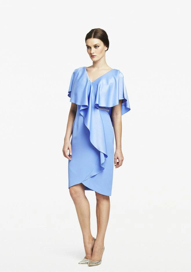 Start your night out right with a stylish dress from Daymor Couture 609. The V neckline of this ruffled draped dress is mirrored at the back and features rhinestone accent at one side of the waist. The dress finishes at midi length with a tulip hemline. This stunning short dress by Daymor Couture will bring together all the essentials for a great and comfortable look at your next special occasion!