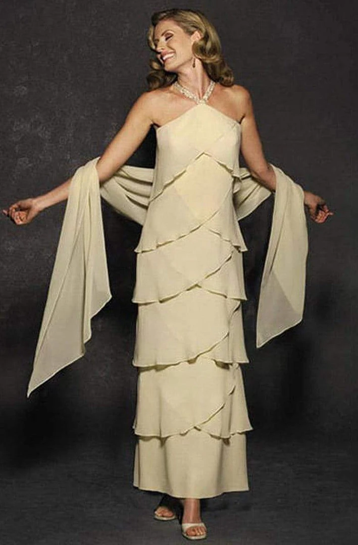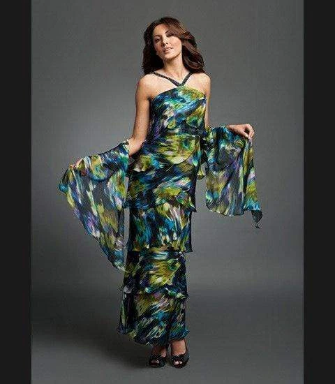 This halter style dress with beaded straps features languid overlapping tiers of silk chiffon in classy column silhouette. The dress finishes at floor length hem.