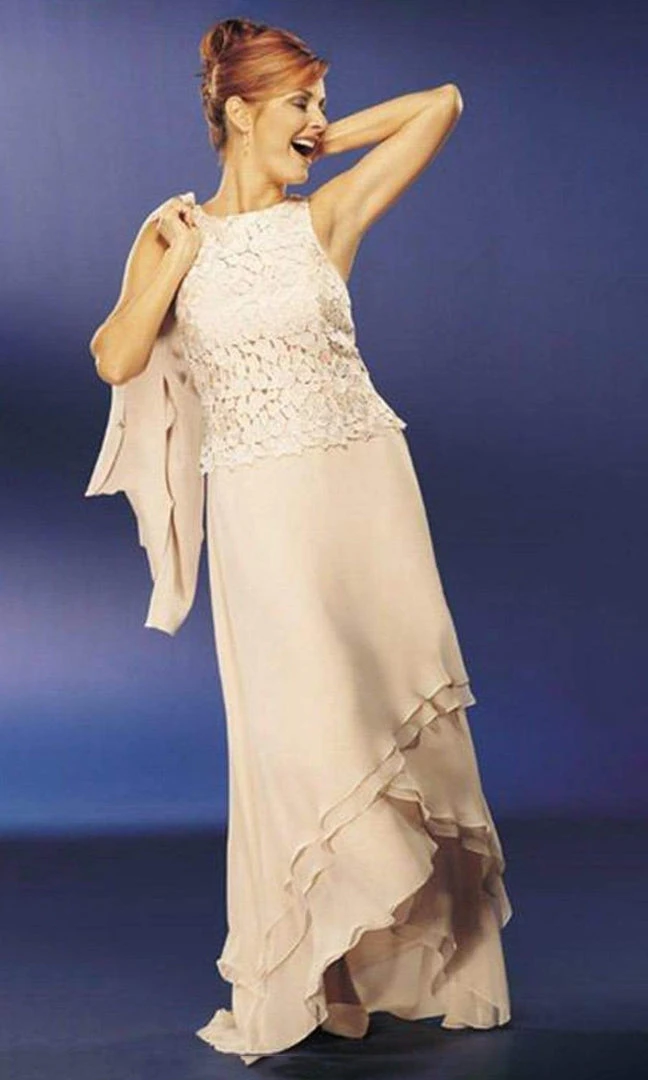 Be the very epitome of understated nobility in this elegantly styled Daymor 5010 creation. Gorgeously designed with an intricate rosette lace, this lovely piece showcases a sleeveless, jewel neckline with a full back. Flowing lavishly from the natural waist, the gossamer A-line skirt flaunts intricate layering that cascades fascinatingly as it completes with a high low tulip hem. Paired with a structured long-sleeved jacket, this elegant ensemble is perfect for that much-awaited event. Dress with sophistication as you flourish your confident gait in this spectacular Daymor masterpiece. Model is wearing the Blush color.
