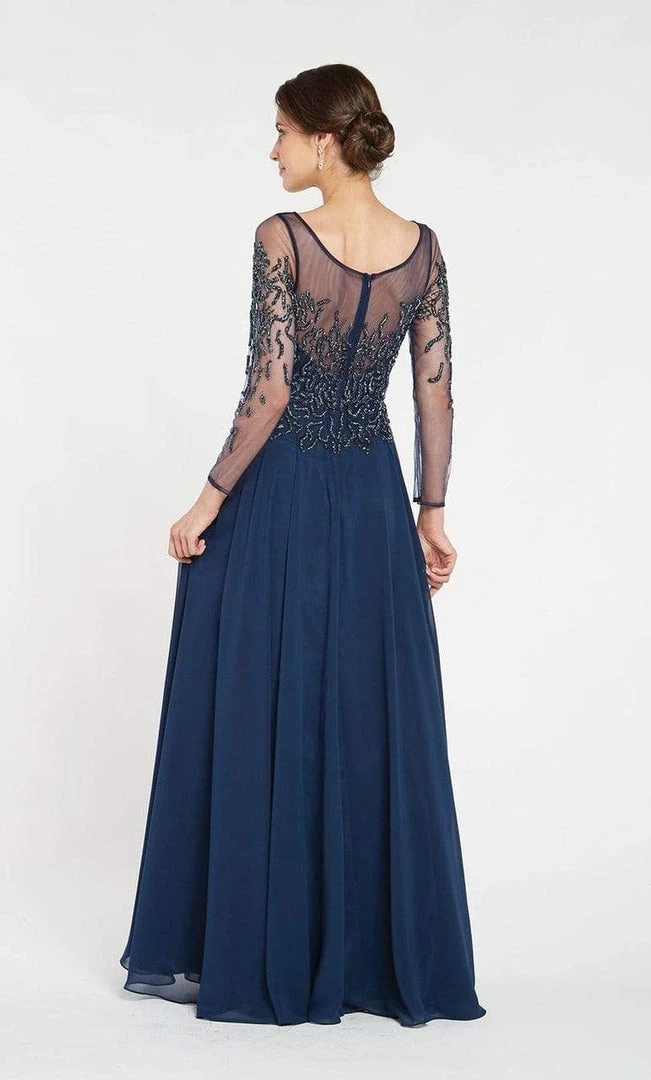 Sparkle in beauty as you make your entrance in Alyce Paris 27244. This long formal dress features an illusion bateau neckline with quarter length sleeves. The bodice is decked with glittering embellishments and shows a scoop back with a zipper closure. The chiffon skirt opens in an A-line silhouette with mini train. This Alyce Paris dress definitely parades the elegant and classy style.