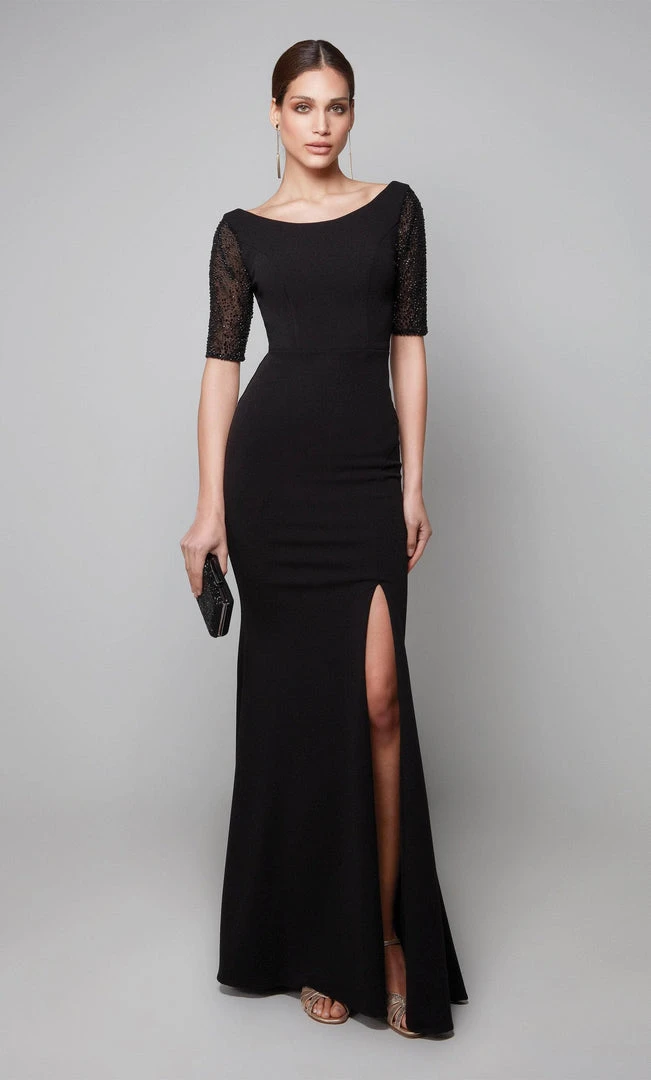 | Details: | Short sleeves, Sheer, Beads, Seams, Mid-open back, Scoop-shaped cut, Zipper closure, High slit |