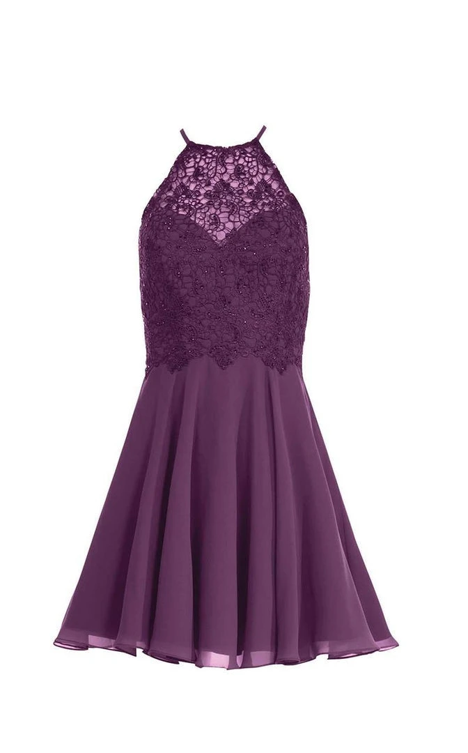 | Details: | Sleeveless, Beaded Lace Bodice, Halter Neck over Sweetheart Lining, Back Straps, Open Back, Chiffon, Mid-Thigh Length |