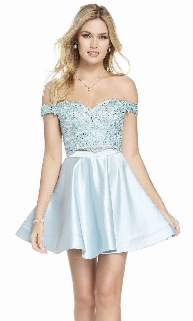 Heighten your charming appeal when you wear this lovely cocktail dress by Alyce Paris 3827. This two piece ensemble features a fitted bodice adorned with scattered heat stones for a sparkling effect crowned with an off-shoulder neckline. A solid band crowns the softly pleated a-line skirt that cascades to the mid-thighs as the mid-open back is secured with a center zipper closure detail. The night is yours in a spectacular piece from Alyce Paris design.