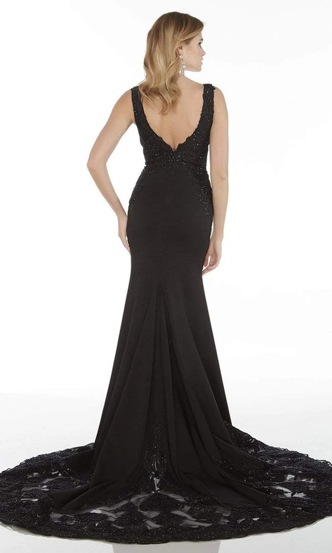 Be strikingly gorgeous in Alyce Paris 5065. This long gown graces a sleeveless, deep V-neckline with an embroidered bodice. The dress flaunts a low V-back and the skirt brings drama with a trumpet silhouette and train finish. Be the lady of the night in this Alyce Paris creation. Model is wearing Black color.