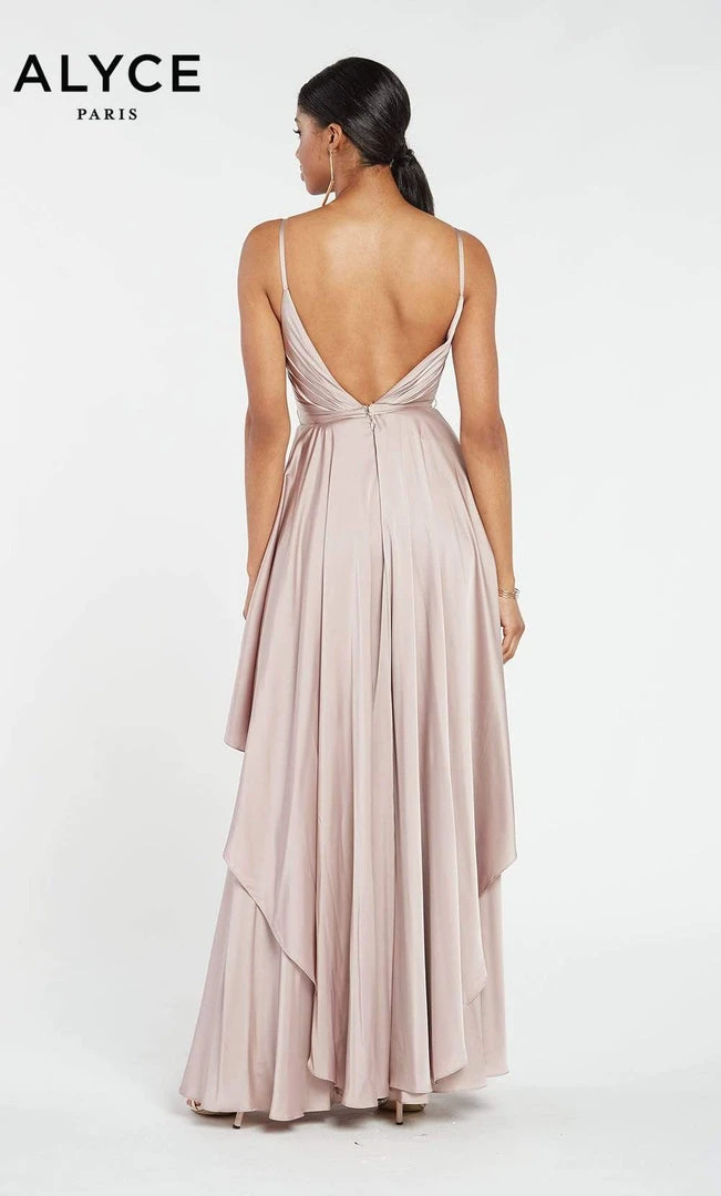 Display your natural beauty and grace in this lovely Alyce Paris 60091 evening dress. This stunning gown is constructed in satin chiffon fabric, with spaghetti straps supporting the deep-notched bodice leading to the open back with an apparent V shape. A sheer decolletage accents the ruched bodice. A slim waistband leads the asymmetrically tiered skirt. This dress is floor length and is secured with a back center zipper closure. Turn heads instantly in this Alyce Paris design.