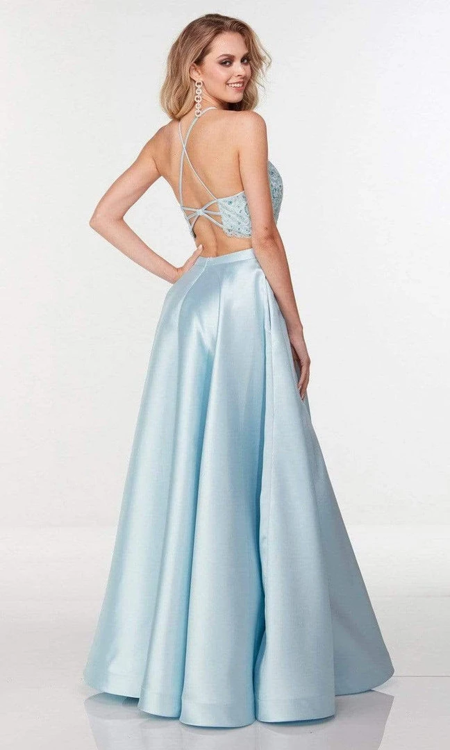 Heighten your charming appeal wearing Alyce Paris 61104 creation. This two piece set features an embroidered crop top crowned with a high halter neckline with a scalloped midriff and has a jewel accent. Spaghetti straps lend support to the top as it crisscross the open back, followed by a center zipper with hook and eye closure. A side slit accents the pleated A-line skirt as it exquisitely flares to the floor. You’ll look fantastic in photos with a beautiful dress from Alyce Paris. Model is wearing a Light Blue color.