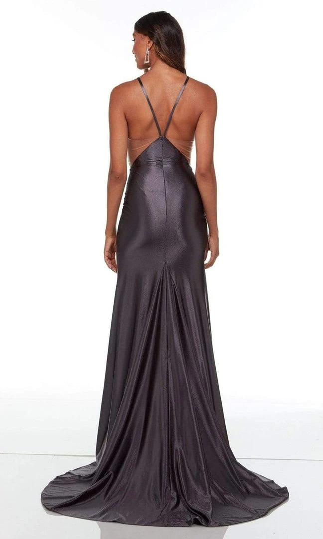 Take their breath away with this stunning Alyce Paris 61161. Flaunt your figure in this satin-made evening gown. It features sexy sheer side on the fitted bodice and opens with a halter neckline. Back is in V cut and the sheath silhouette finishes off with a sweep train. Flatter your finest assets as you enthrall the crowd in this Alyce Paris.