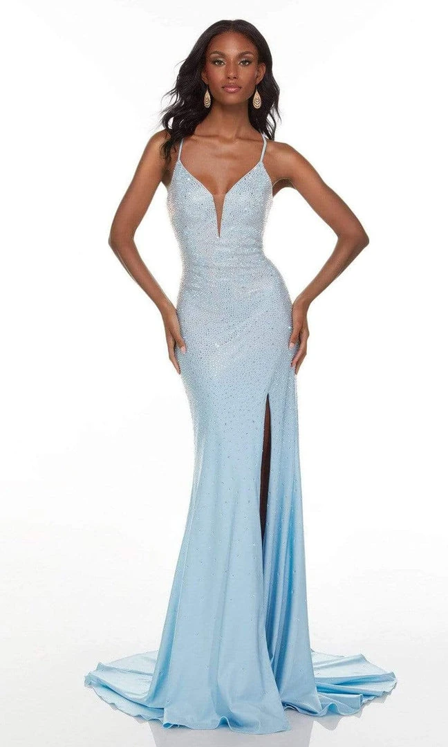 Bask in the timeless glamour of this Alyce Paris 61175 creation. Glinting with beadwork on its sleek silhouette, this stunner creates a plunging v-neckline with spaghetti straps. Ornate with a lace up bandeau strap with a low cutout, the sheath skirt reveals a slit as it pools into a train. Astound everyone in this Alyce Paris masterpiece.