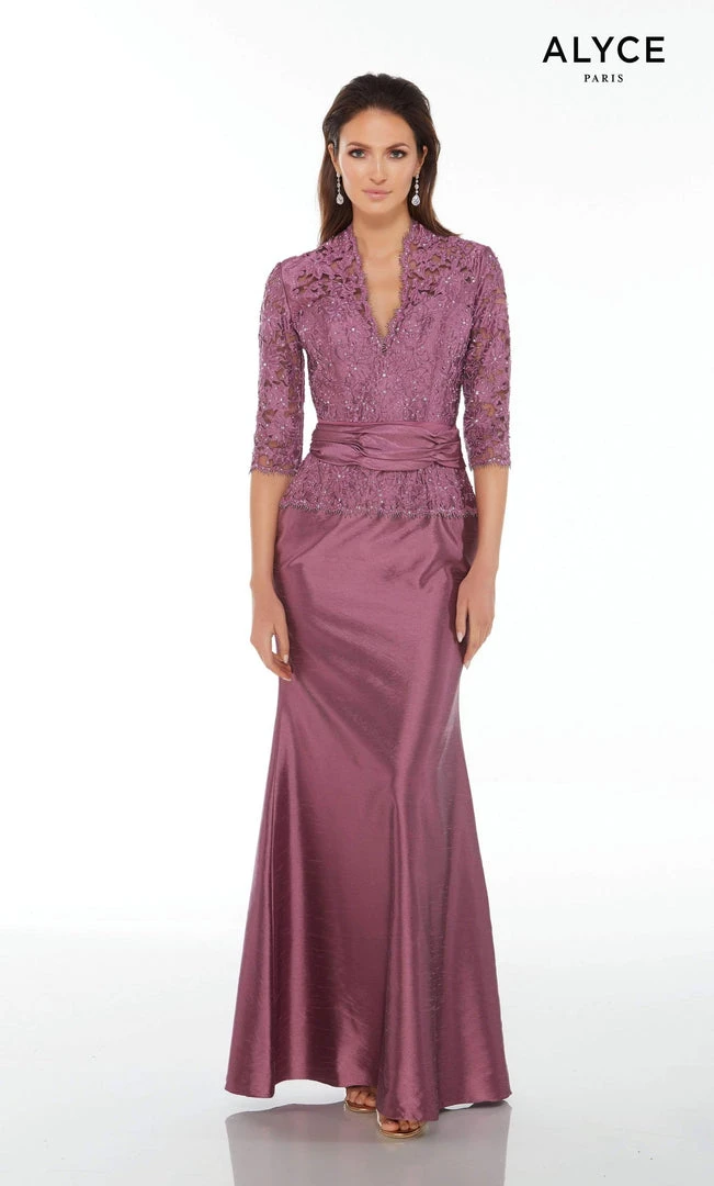 Show off your classy style when you wear this sophisticated Alyce Paris Black Label 29143 Evening Dress. A three-quarter sleeves gown with a subtle scalloped-trimmed V-neckline bodice, crafted in rich lace material. The waist features a ruched band. The laced top extends below the waist, giving way to the silky textured fabric of the skirt that drops with back godet making up a mermaid silhouette finish. This classy style by Alyce Paris Black Label is charming and versatile, perfect for social galas and weddings. Please note the dress does not include the floral accent at the belt.