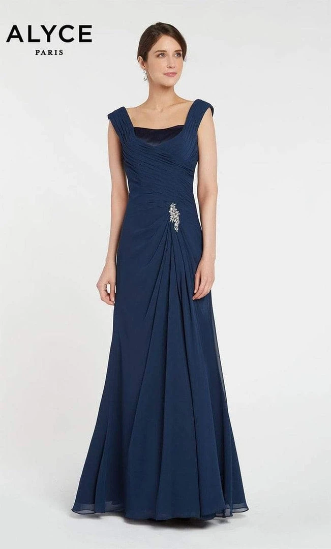 Draped A-line long dress with off-the-shoulder wrap-over bodice. Gathered hip with rhinestone accent and back sash.