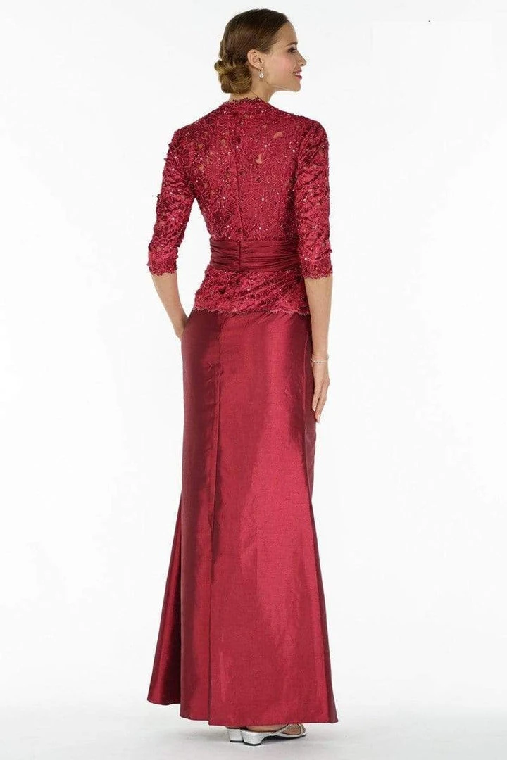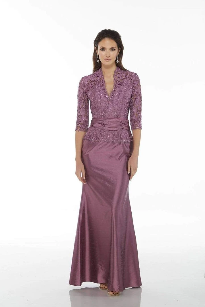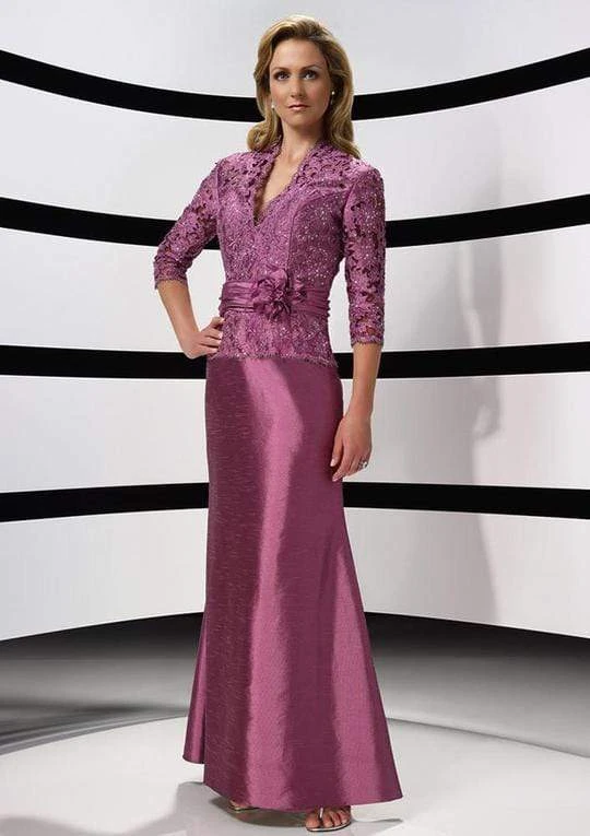 Show off your classy style when you wear this sophisticated Alyce Paris Black Label 29143 Evening Dress. A three-quarter sleeves gown with a subtle scalloped-trimmed V-neckline bodice, crafted in rich lace material. The waist features a ruched band. The laced top extends below the waist, giving way to the silky textured fabric of the skirt that drops with back godet making up a mermaid silhouette finish. This classy style by Alyce Paris Black Label is charming and versatile, perfect for social galas and weddings. Please note the dress does not include the floral accent at the belt.