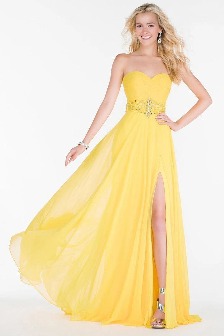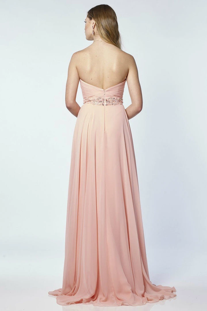 Elegant chiffon gown with a slit in the front, sweetheart neckline, pleated bust with embellishment at the waist and a open slight v back.