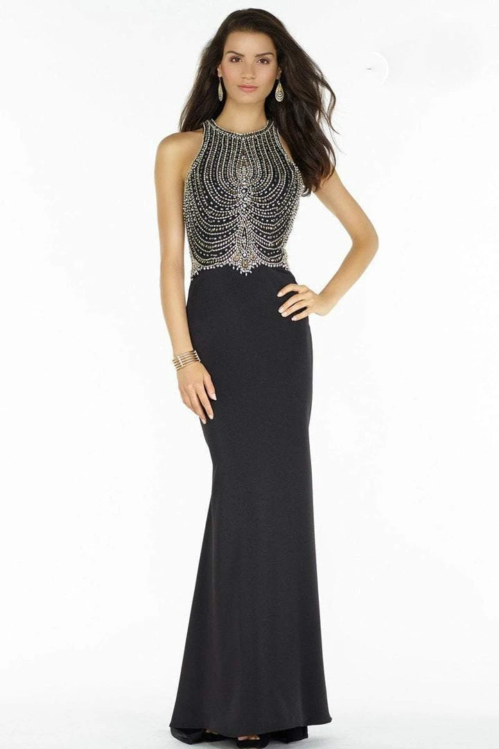 Elegant stretch crepe gown with an embellished bodice, halter neckline and a keyhole midback.