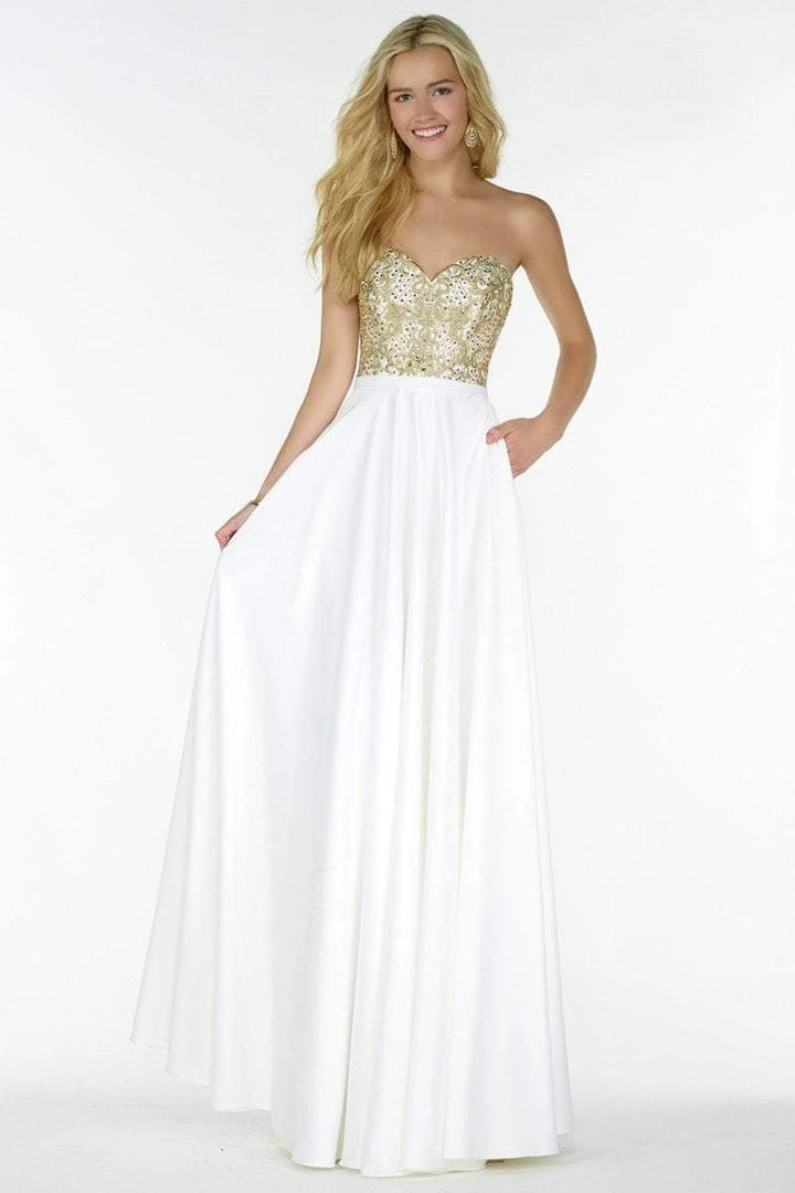 Stunning satin gown with an embellished top and a strapless sweetheart neckline.
