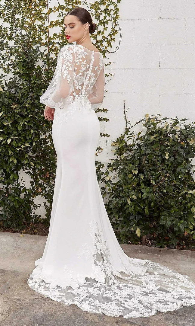 | Details: | Beaded, Sheer Bishop Sleeves, Embroidered Details, Illusion Back, Buttons, Sheer Court Train |