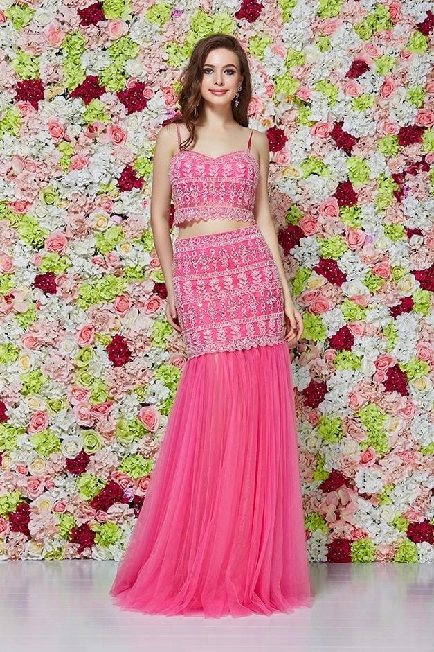 Get ready for everyone to stop and stare when you show up in this Angela & Alison 61003. Thin spaghetti straps support the sweetheart bodice embellished with shimmering stripes of sparkling jeweled adornments. Darling details accent the bare midriff as this amazing two-piece ensemble slides to the full-length trumpet silhouette hem in fluttering layers of soft flowing tulle. Be in this gorgeous Angela & Alison creation and leave a lasting impression.