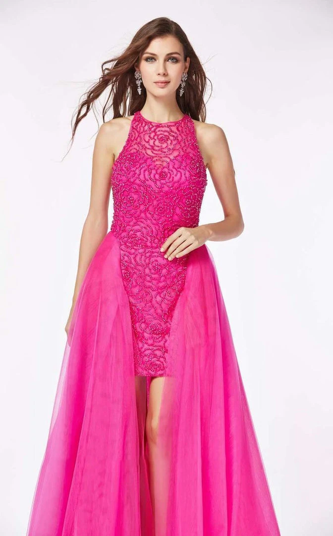 Expect to be turning heads as you walk into your special event wearing this creatively romantic Angela and Alison 61101 gown. This lovely creation features an illusion halter neckline with a sweetheart lining and dazzles with sparkling floral details creating a subtle and shimmering style. Fitted to the mid-thigh, this wonderful gown highlights fabulous cascading draped adornments at the slides that float to the floor in decadent, ethereal layers. The back is highlighted by a cutout detail with a center zipper closure. This Angela and Alison design will absolutely make you feel special!