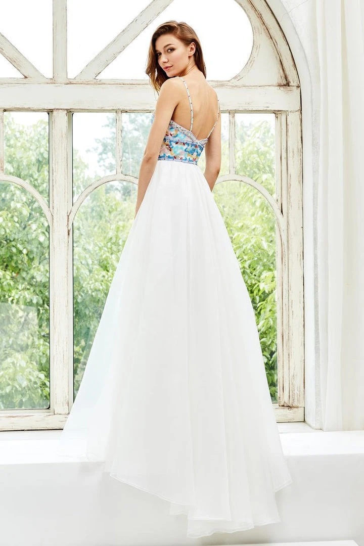 | Details: | Sleeveless, Spaghetti strap, Beaded bodice, Mid-open back, Layered chiffon skirt |