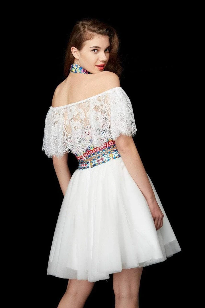 Look immaculately stunning in this bohemian-inspired Angela & Alison 72022 creation. Unveiling a spectacularly vibrant spectacle of floral embroidery festooned on this lavish piece, this knockout has an embellished choker, a strapless straight-across neckline and a mid-open back on a cropped top. Embraced along the natural waist with a vividly ornamented band, the tulle layered skirt flares in lovely pleats that completed at a short hemline. This ensemble has a sheer intricate lace with scalloped hem that can be overlaid to mimic an off-shoulder style. Showcase your brilliant fascination with free-spirited style in this gorgeous Angela & Alison masterpiece.