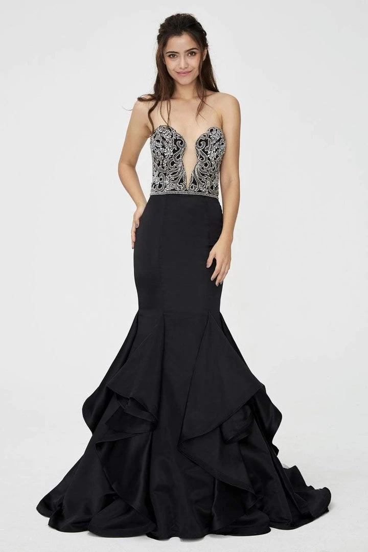 Channel red carpet glamour wearing this elegant evening gown by Angela and Alison 81139. The strapless bodice boasts a plunging sweetheart neckline with sheer panel insert. The bodice is embellished with beadwork in an intricate pattern. Form-fitting to the low hip, this enchanting ensemble drapes to the darling full-length mermaid silhouette hem in lush cascading layers of ruffle for a fairytale black tie style. This Angela and Alison creation is sure to make you steal the show.
