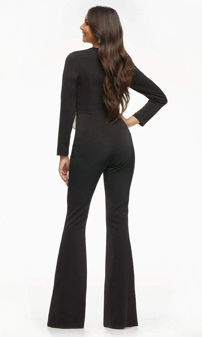 Go for a timeless and sophisticated look wearing this prominent look by Ashley Lauren 11105. Show off and highlight your height and figure as you wear this body fitted jumpsuit. Bottom is flared and it has three bow details in front and front cut outs. It features long sleeves and a closed jewel neckline. Embrace a style that is immaculately sultry as you glam up for your event in this Ashley Lauren creation.