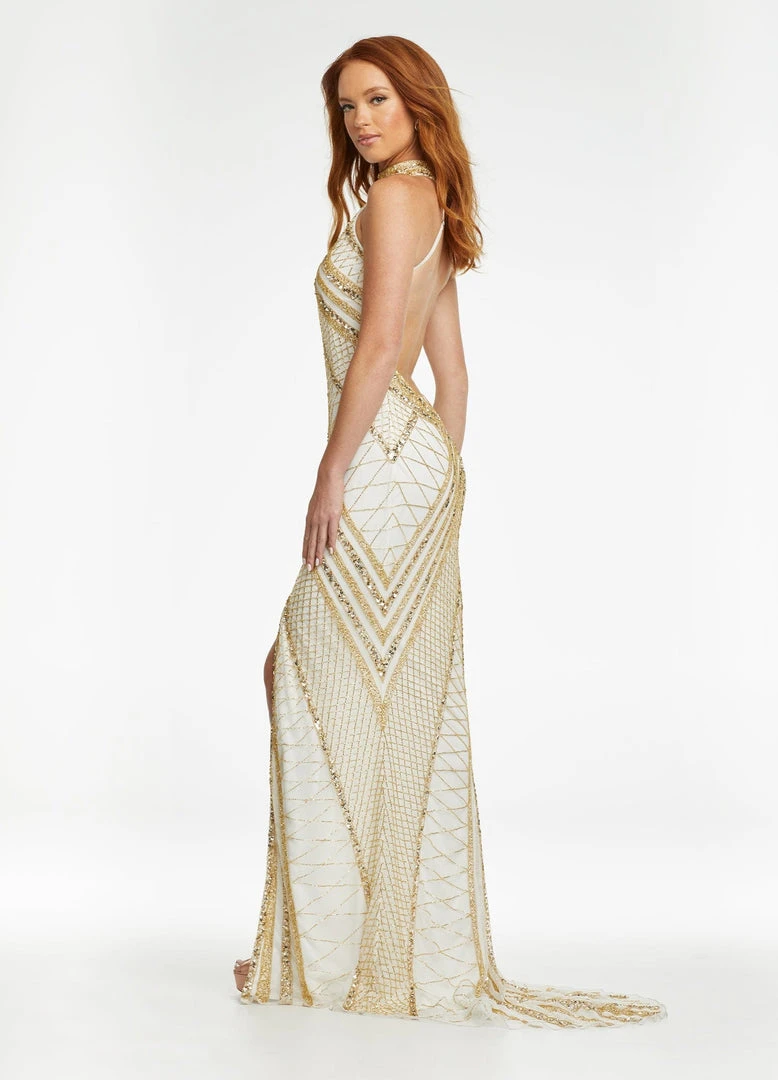 Start off the spectacular evening with flair in this Ashley Lauren 11177 creation. Styled with an intricately hand beaded silhouette, this gown charms with a high halter neckline on a sleeveless bodice. Straps accent the open back design as a sexy front slit adorns the sheath skirt as it traverse into a train. Leave them breathless in this Ashley Lauren masterpiece. Models are wearing the Ab/Ivory, Fuchsia/Black, Gold/Ivory, Clear/Lilac, Rose Gold and Silver colors. Ashley Lauren is one of the most popular brands to look for this year offering endless options in special occasion dresses.