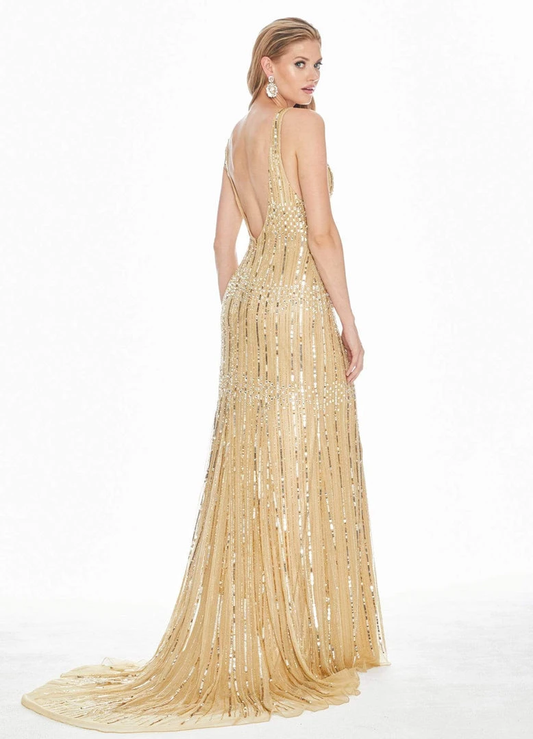 You will look absolutely stunning in this evening dress by Ashley Lauren 1420. This stunner features a fitted bodice with a plunging V neckline mirrored with a V back. Horizontal beads and sequins fully adorn this ensemble, providing a lengthening effect. This gown showcase a sheath silhouette that tapers to full length completed with a sweep train. Be a head-turner beauty at your next social event with this Ashley Lauren piece.